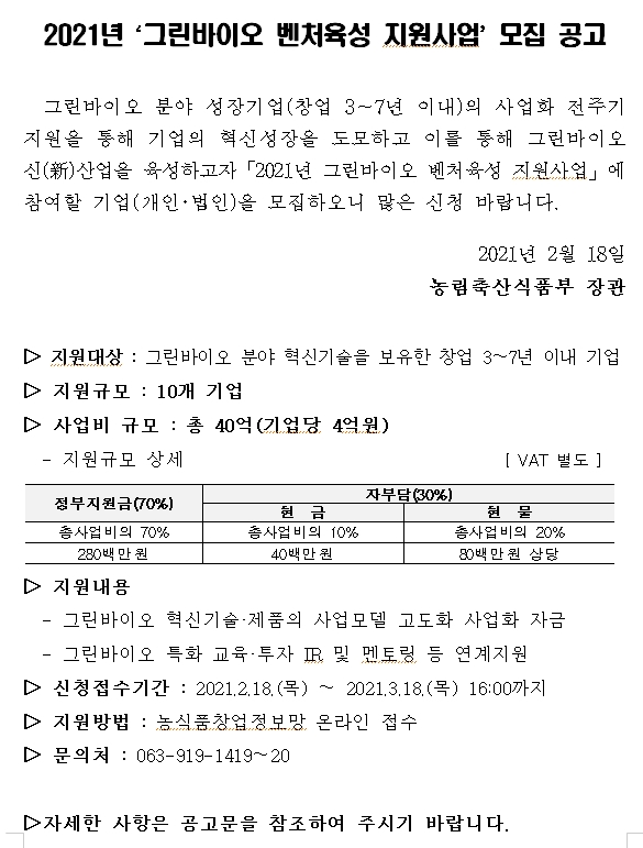 | 사업명 | 2021년 ‘그린바이오 벤처육성 지원사업’ 모집 공고 |
